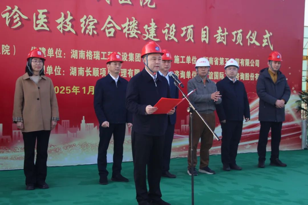 2025年1月6日,湖南省人民医院马王堆院区住院门诊医技综合楼建设项目迎来了主体结构顺利封顶。湖南省卫生健康委党组成员、副主任刘平安,委规划发展和信息化处处长倪友平,湖南省人民医院党委书记赵卫华,公司党委书记、董事长林坚等出席封顶仪式,湖南省人民医院院长肖亚洲主持封顶仪式。