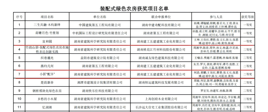 近日,由湖南省勘察设计协会等权威机构联合主办的“湖南省装配式绿色农房、城市家具和市政微型综合管线设计竞赛”获奖名单正式公布。此次竞赛中,湖南建投五建建筑工业化有限公司与湖南省建筑科学研究院有限责任公司、建投五建设计分公司等单位强强联合,参加绿色农房单元竞赛,凭借在装配式建筑领域的深厚技术积淀与卓越的协同创新能力,一举斩获一等奖1项,二等奖2项的优异成绩。
